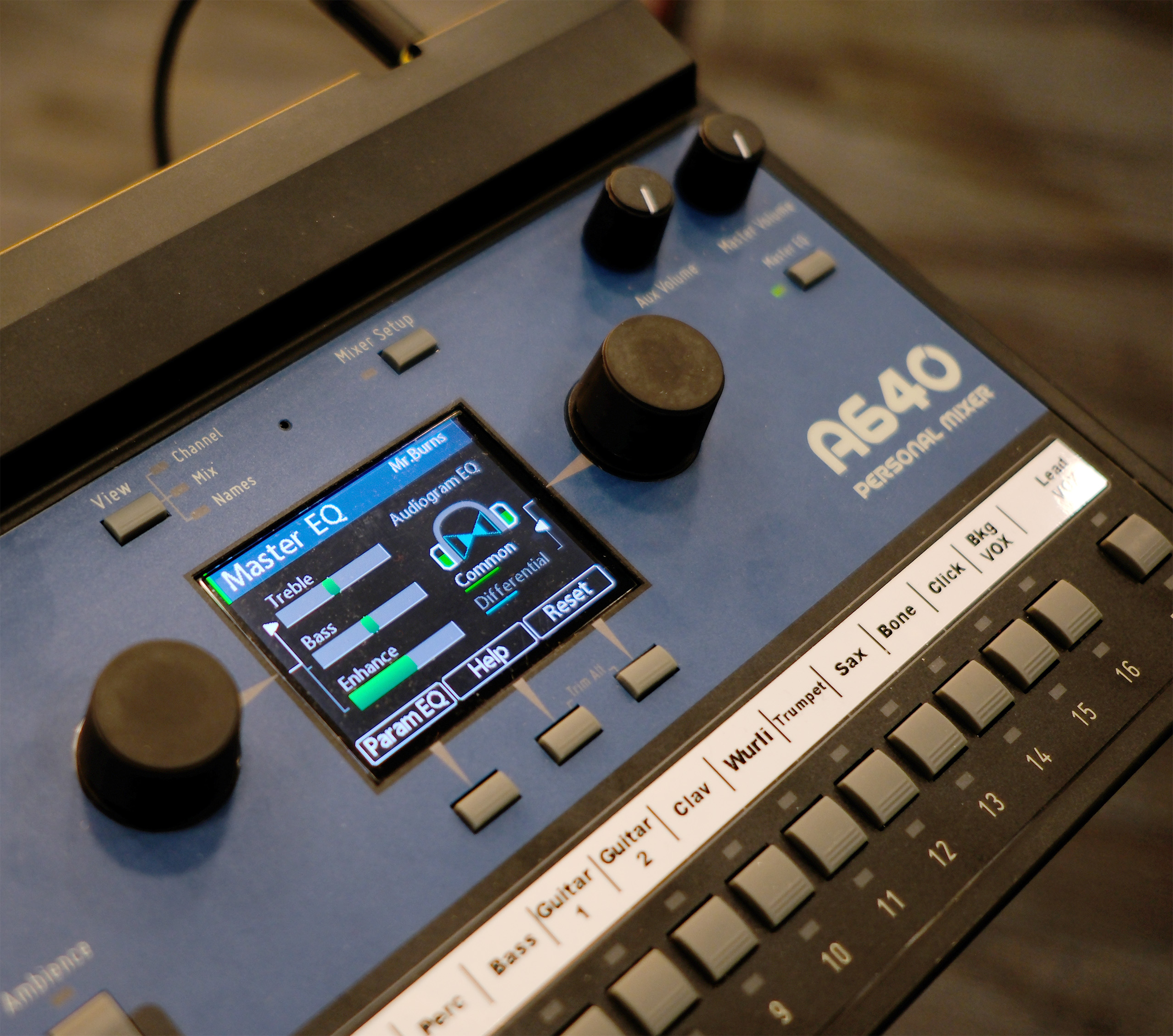 The A640 Personal Mixer combines a powerful mix engine with an intuitive user interface that doesn't get in your way while performing. The A640's color hi-res display has three Mix Views showing you all the details about your mix without sacrificing editing simplicity. Switch between them at any time with the dedicated View button.